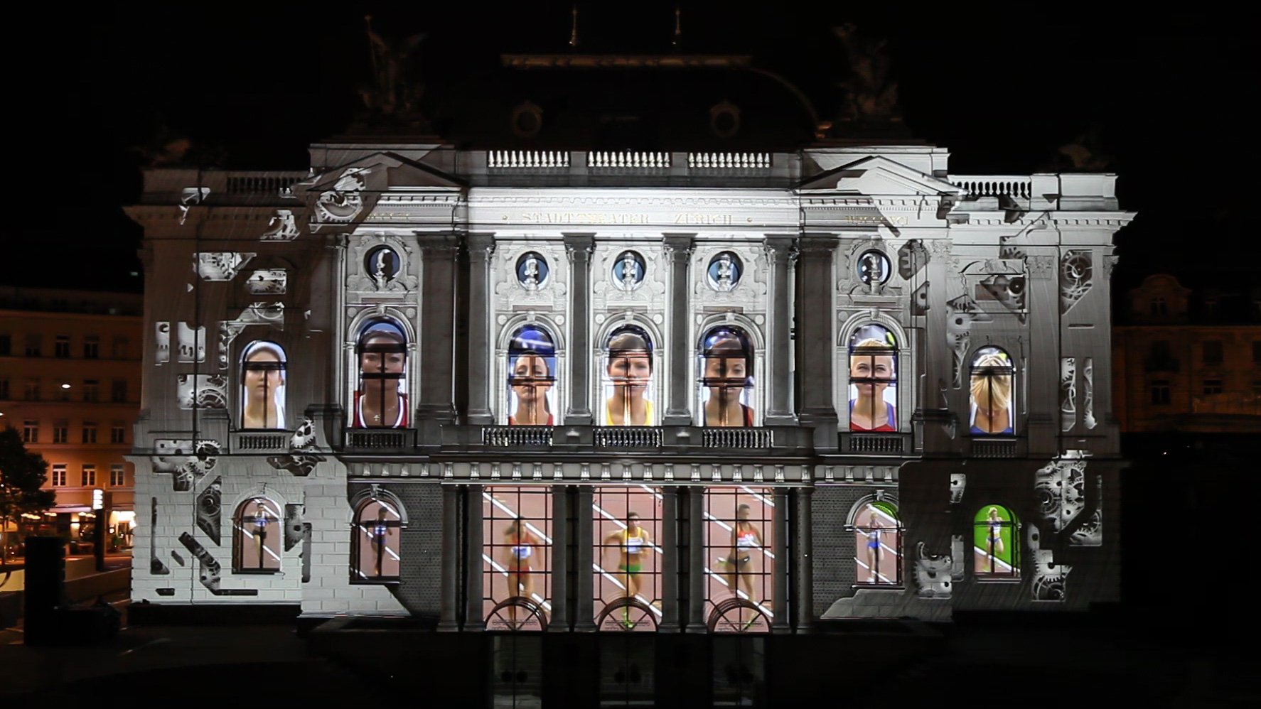 Zur Leichtathletik Europameisterschaft in der Schweiz wurde ein besonders bewegendes Projekt für das Züricher Opernhaus verwirklicht. Im Zuge eines 3D-Videomappings wurden die Themen Athletik und Kunst in Form einer Story vereint: Ein virtuelles Buch versetzte die Betrachter zurück in die Geschichte der Leichtathletik in der Schweiz bis ins Jahr 1954 und hin zum Letzigrund Stadion, dem Austragungsort der Spiele. Die Schweizer Tradition, versinnbildlicht in Form eines Uhrwerks, führte in Kombination mit sportlichen Elementen hin zu Flaggen – Synonym für die internationalen Teilnehmer. Am Ende der Geschichte gewann das Opernhaus seine Identität zurück und verneigte sich unter dem Applaus der anwesenden Besucher.